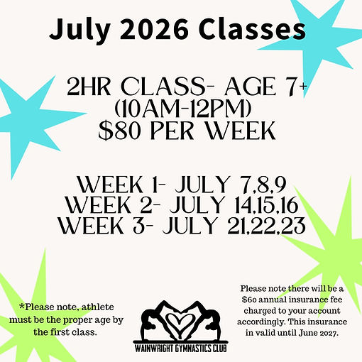 We are located in Wainwright, Alberta at the Peace Memorial Multiplex upstairs. We offer Recreational classes which follow the CanGym badge program along with Competitive training.